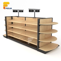 멀티 티어 곤돌라 선반 나무 소매 디스플레이 랙 블랙 메탈 프레임 양면 상업 상점 보관 비품