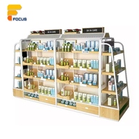 멀티 티어 곤돌라 선반 스킨 케어 제품 디스플레이 캐비닛 유리 패널 나무 선반 양면 보관
