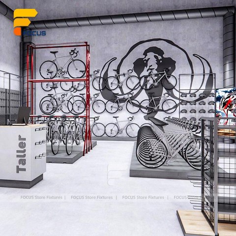 현대 자전거 상점 디스플레이 인테리어 비품 전체 세트 도로 자전거 소매점 디자인 벽 랙 의류 기어 디스플레이