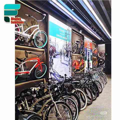 현대 자전거 가게 인테리어 디스플레이 비품 전체 세트 사용자 정의 소매 자전거 랙 벽 마운트 의류 선반 디자인